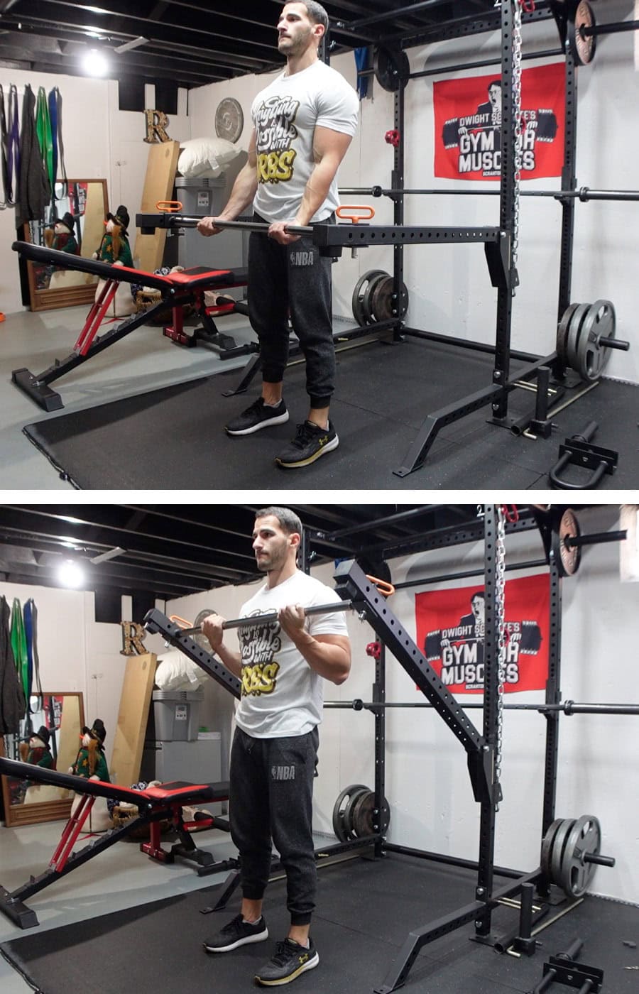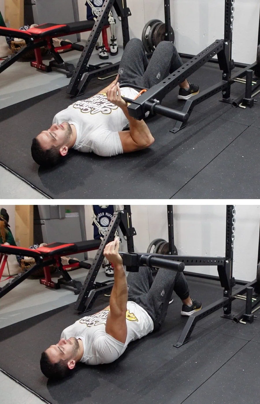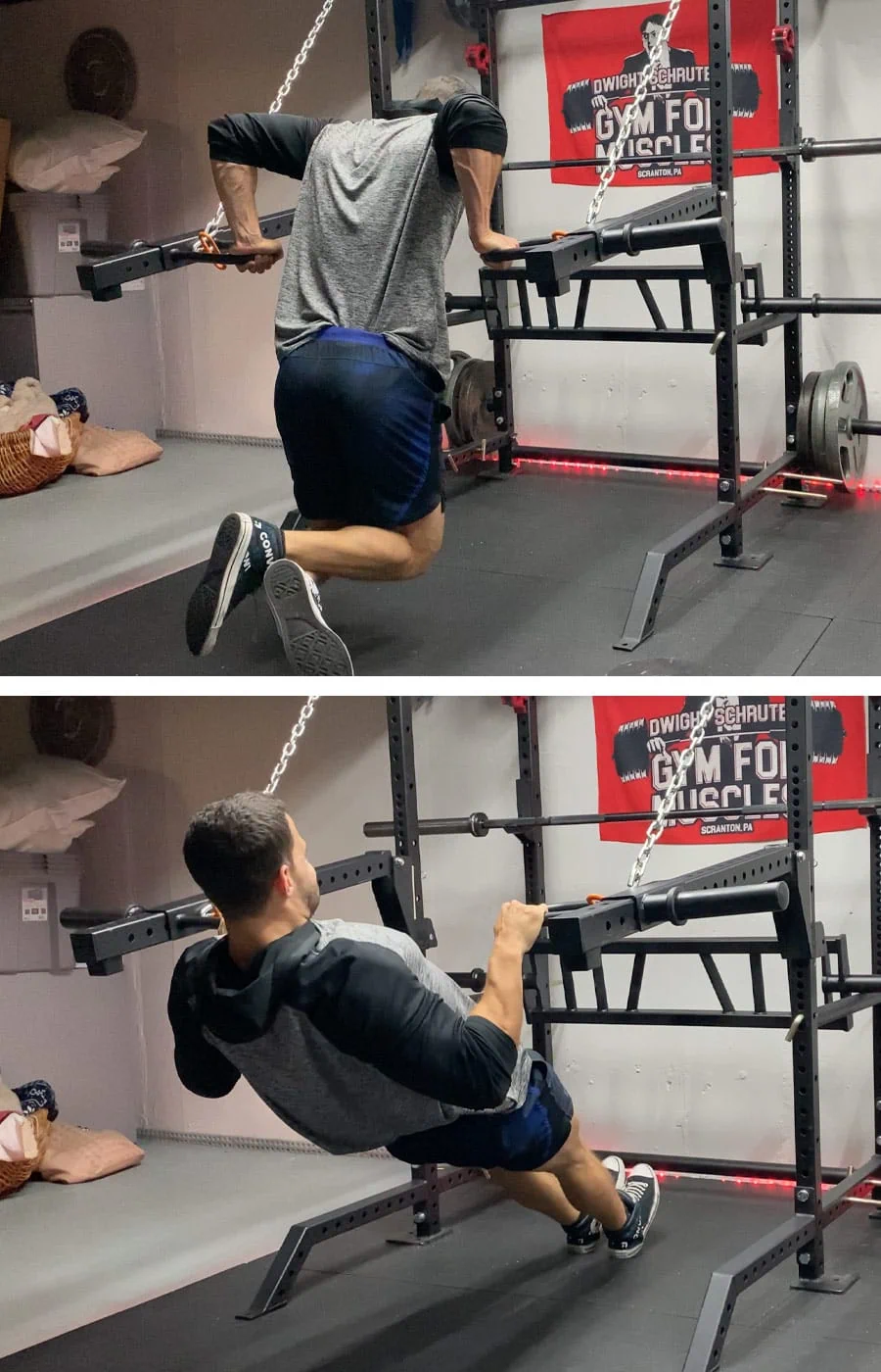With the arms in the same position, you can also perform inverted rows. This is an exercise that you can perform with your racked barbell, but if you like to superset (go back and forth between exercises without rest), this variation can be extremely useful so you can use your barbell for other exercises.