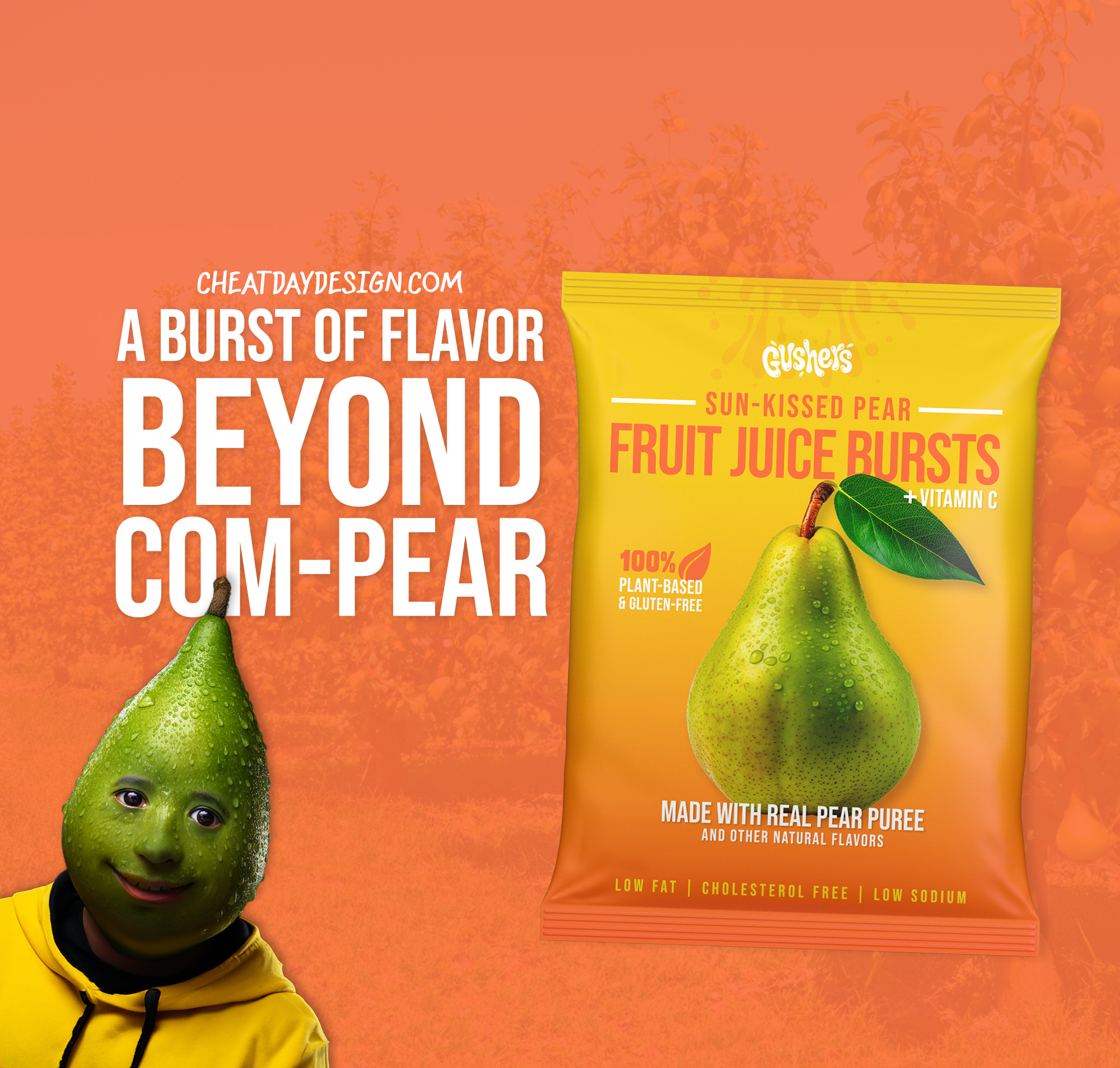 Switched from exploding candy imagery to a real pear photo. Instead of cartoon Gushers bursting with liquid, you get a beautiful, fresh pear with water droplets. Complete perception flip.