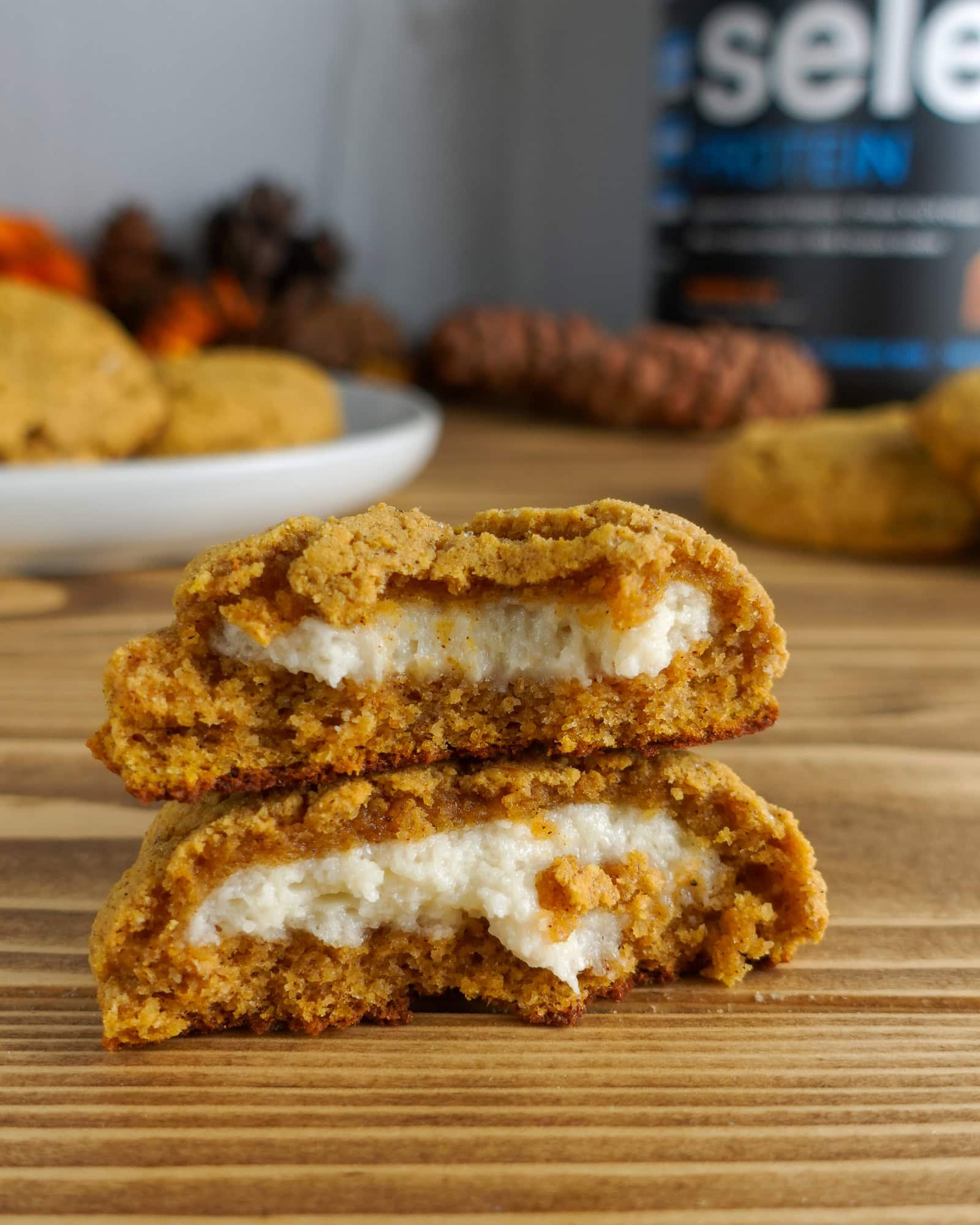 A high-protein pumpkin cookie stuffed with a delicious cheesecake filling. Low carb, gluten-free, and 12g protein per cookie.