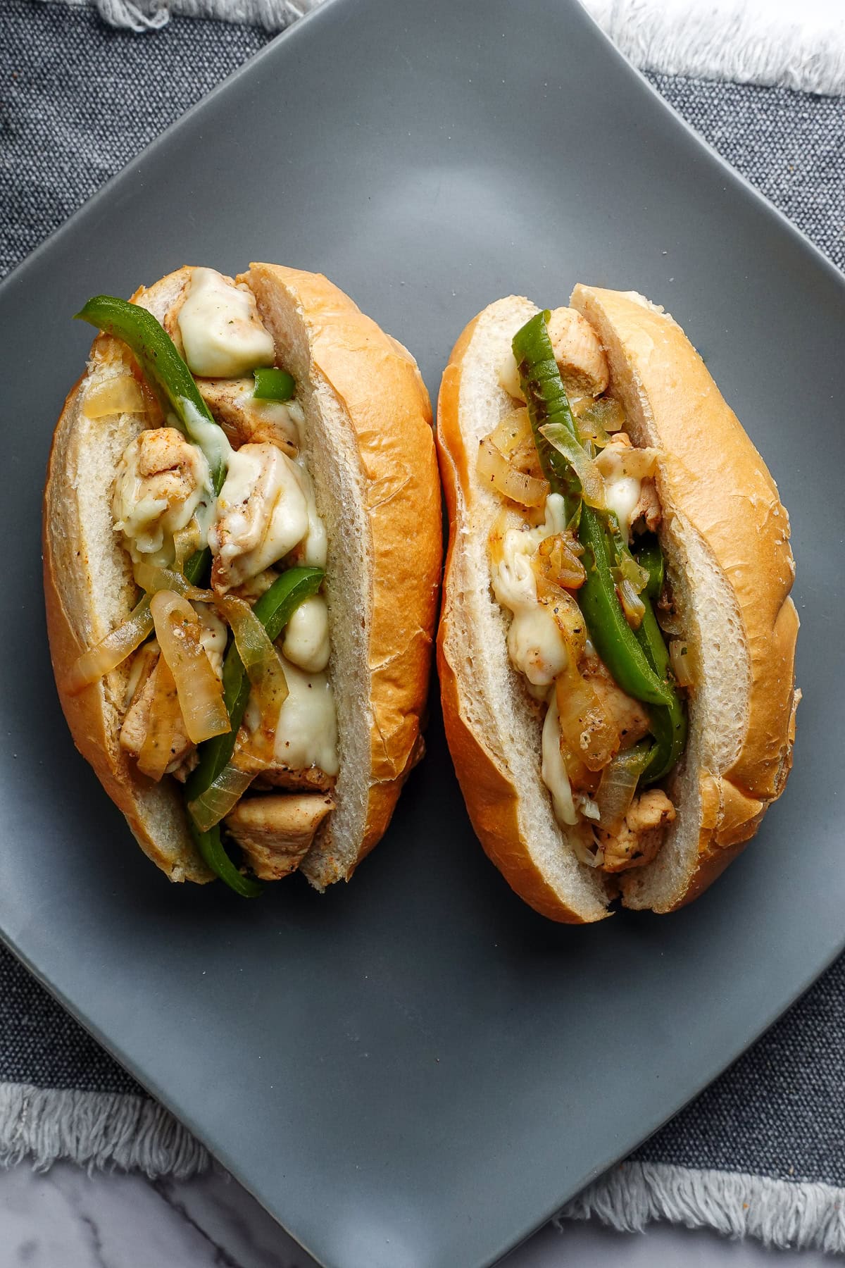 Chicken cheesesteaks take only 15 minutes to make (from scratch) and are an insanely delicious way to hit your protein goals! Each sandwich contains 50g of protein, so to say it's very filling is an understatement.