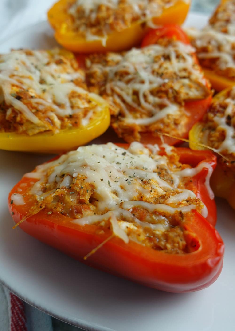 These chicken parm stuffed peppers are absolutely perfect for meal prep! They require only minutes to throw together and taste exactly like classic chicken parmesan.