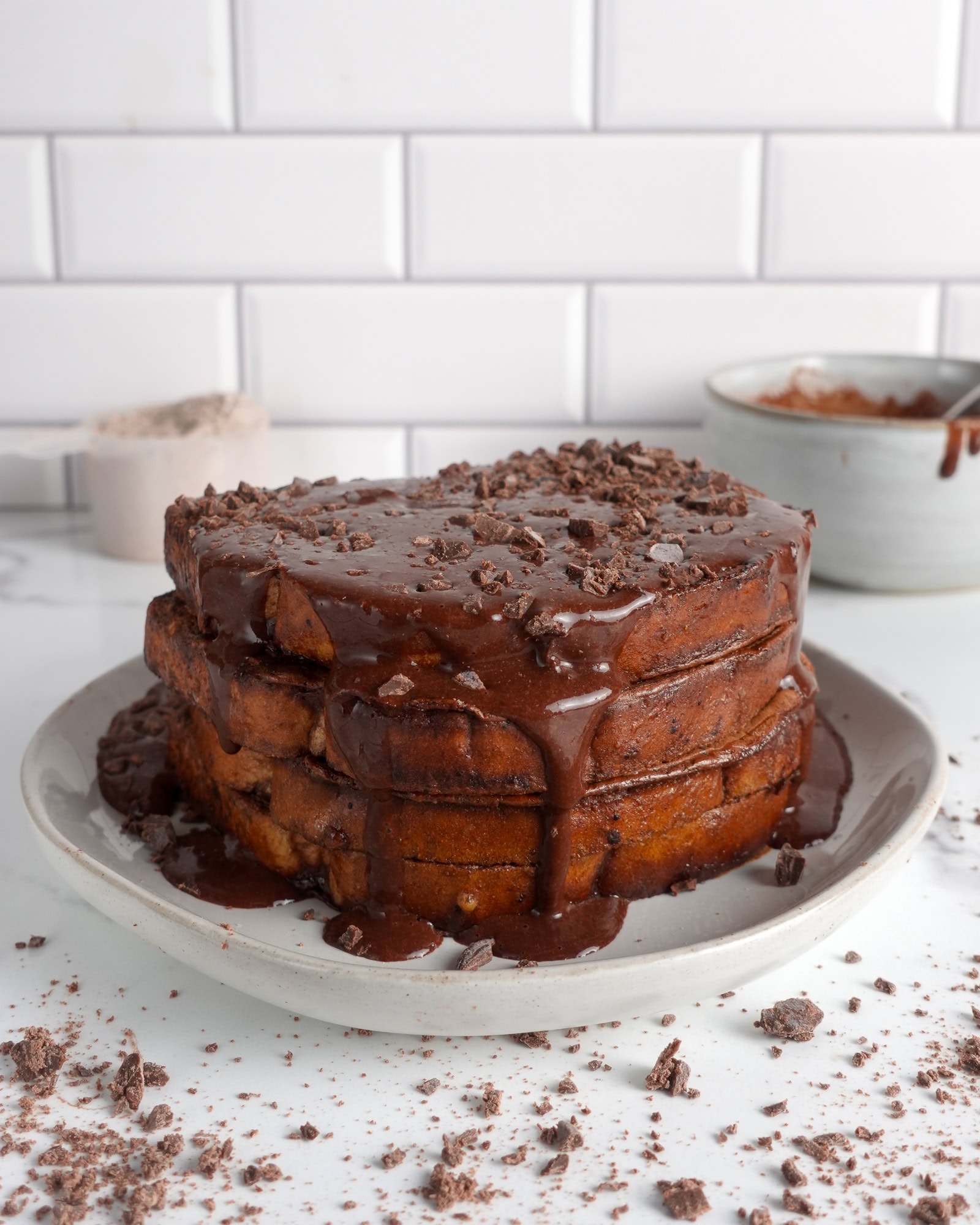 - Pour the chocolate sauce over the top of the chocolate French toast and enjoy!
