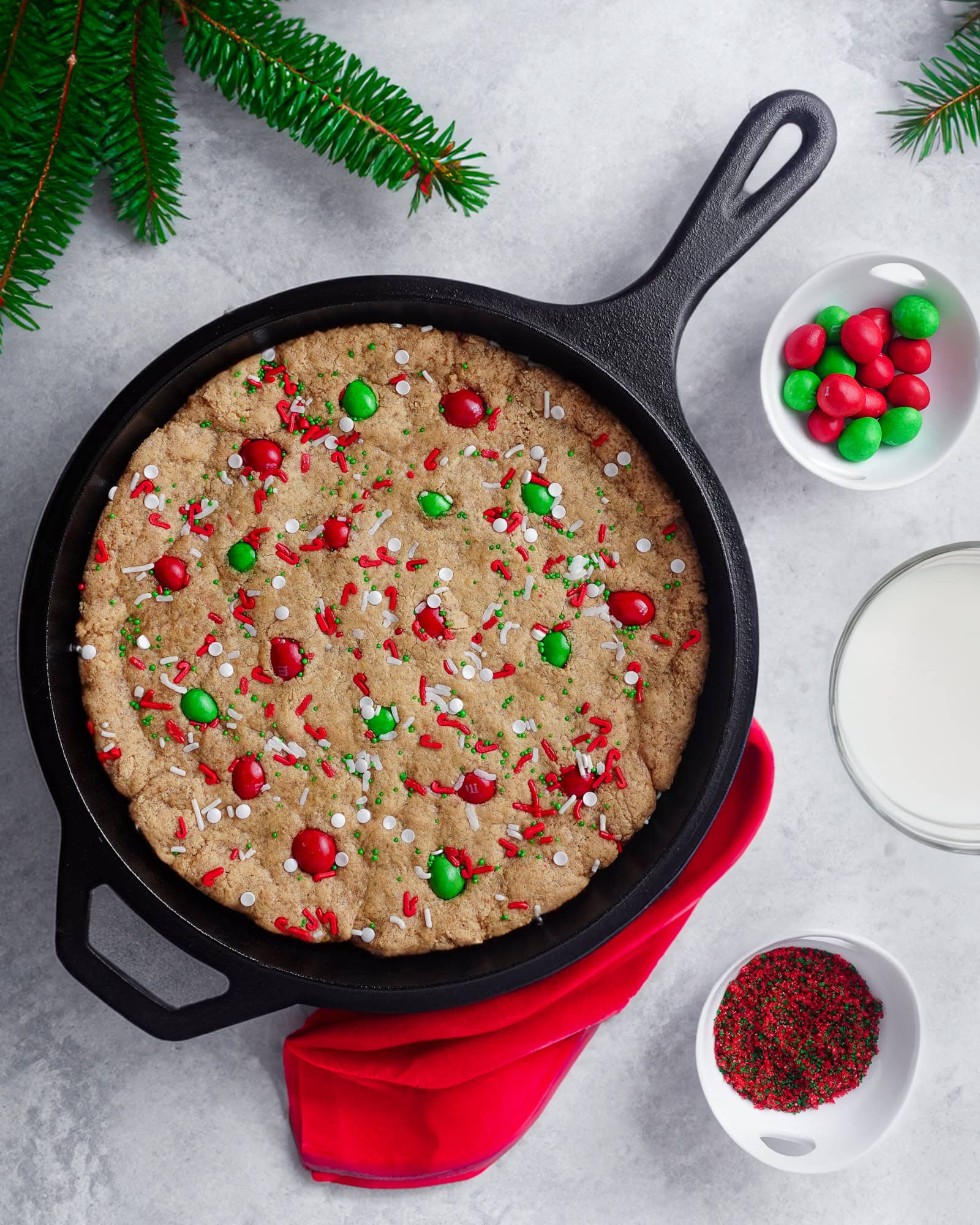 - Add the M&Ms on top of the skillet, lightly pressing them into the dough, and then add sprinkles to make your Christmas cookie skillet even more festive. Lightly press everything down with your hands to make sure the sprinkles stick to the cookie dough.