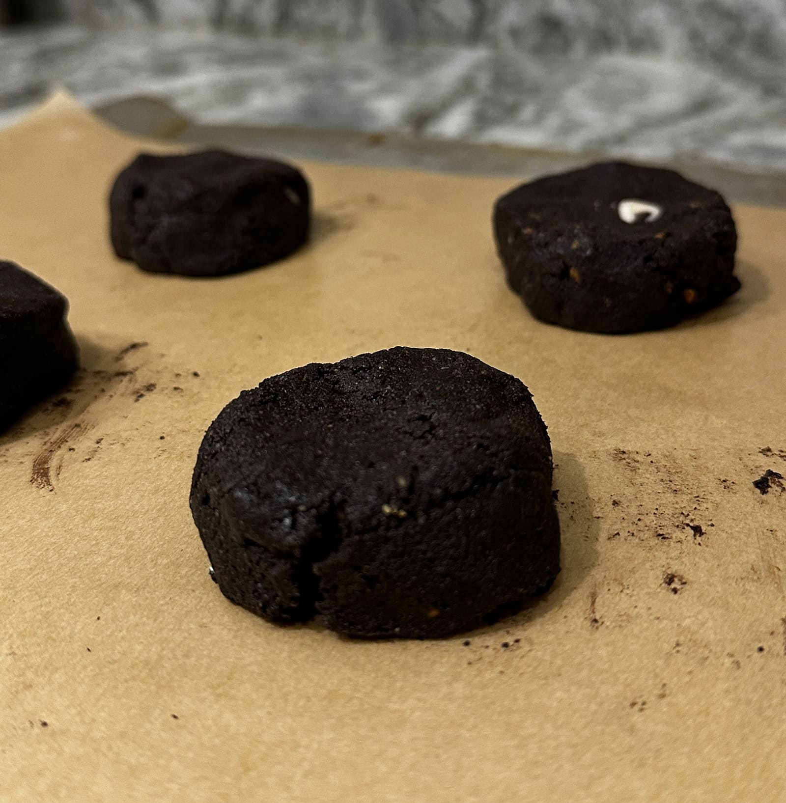 - Break the cookie dough up into 6 balls and place them on a parchment paper-lined baking sheet. This dough will turn your hands black (that's just the nature of black cocoa powder) but don't worry, it will rinse right off.