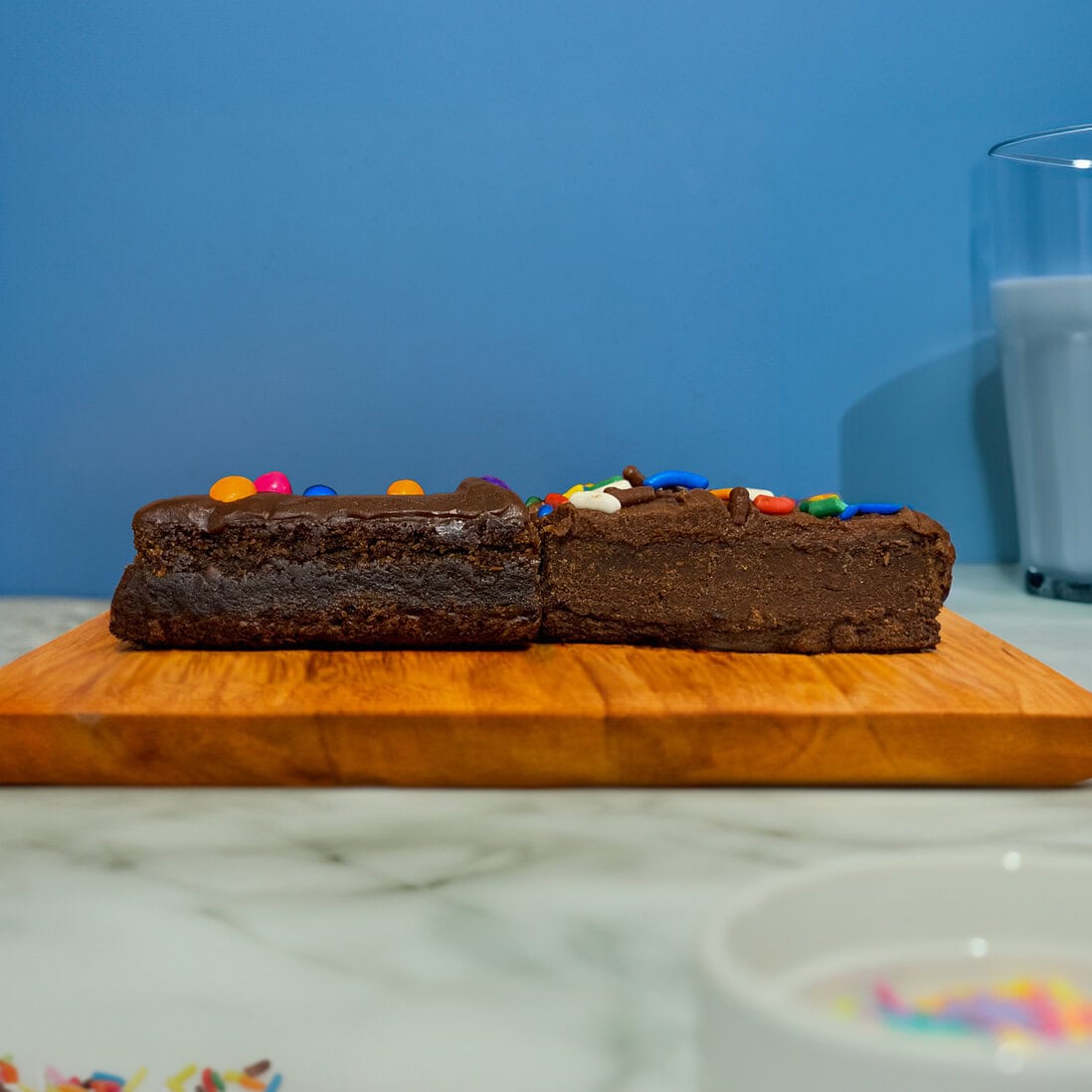 No Cosmic Brownie is complete without that signature frosting and colorful sprinkles. We’re keeping things simple (and delicious) by using store-bought sugar-free chocolate frosting mixed with a bit more protein powder. This little hack adds extra protein while maintaining that classic Cosmic Brownie look and taste.