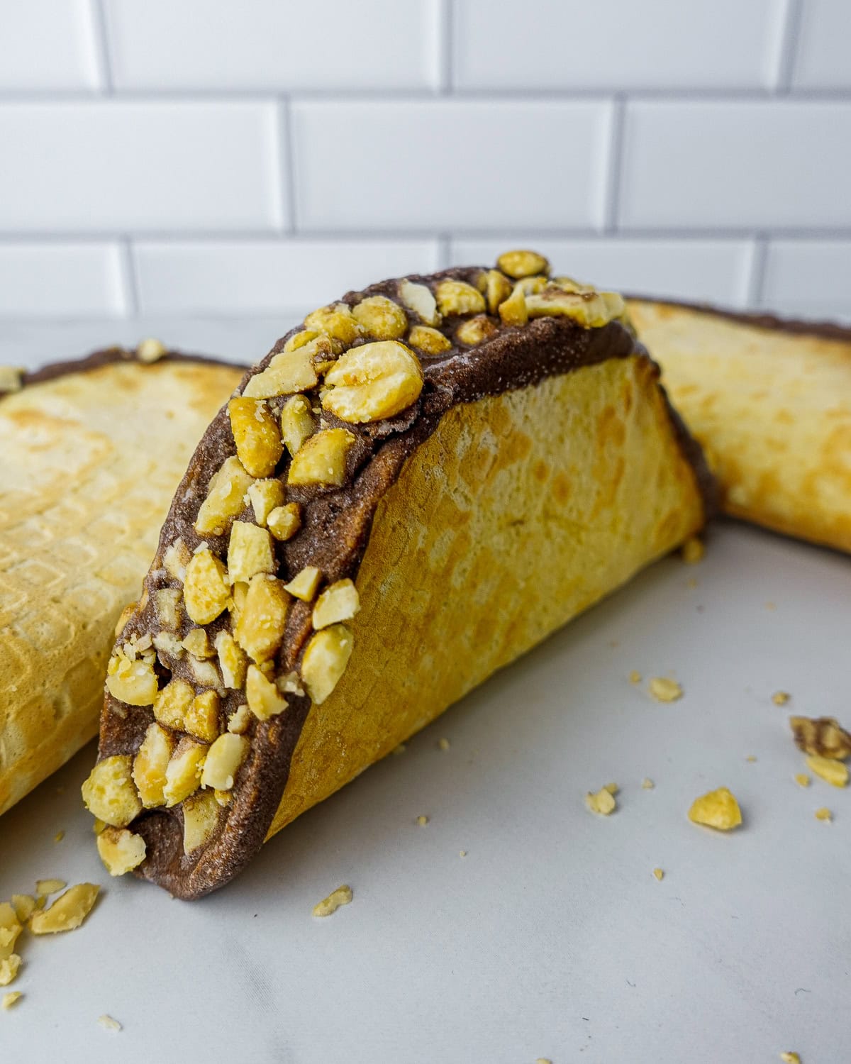 - The shells are meant to be slightly crispy but still a little soft like a regular Choco Taco. If you want a very crunchy shell like a waffle cone, leaving the protein powder out should accomplish that.