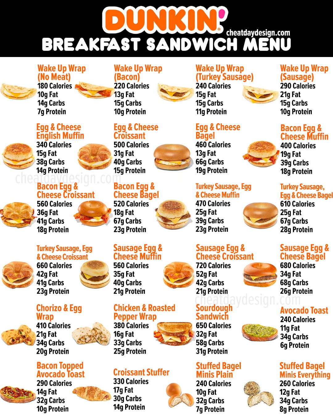 Note that Dunkin’ is often releasing limited-time food items, so you may not see the most recent breakfast items below. However, most of the basics are covered: