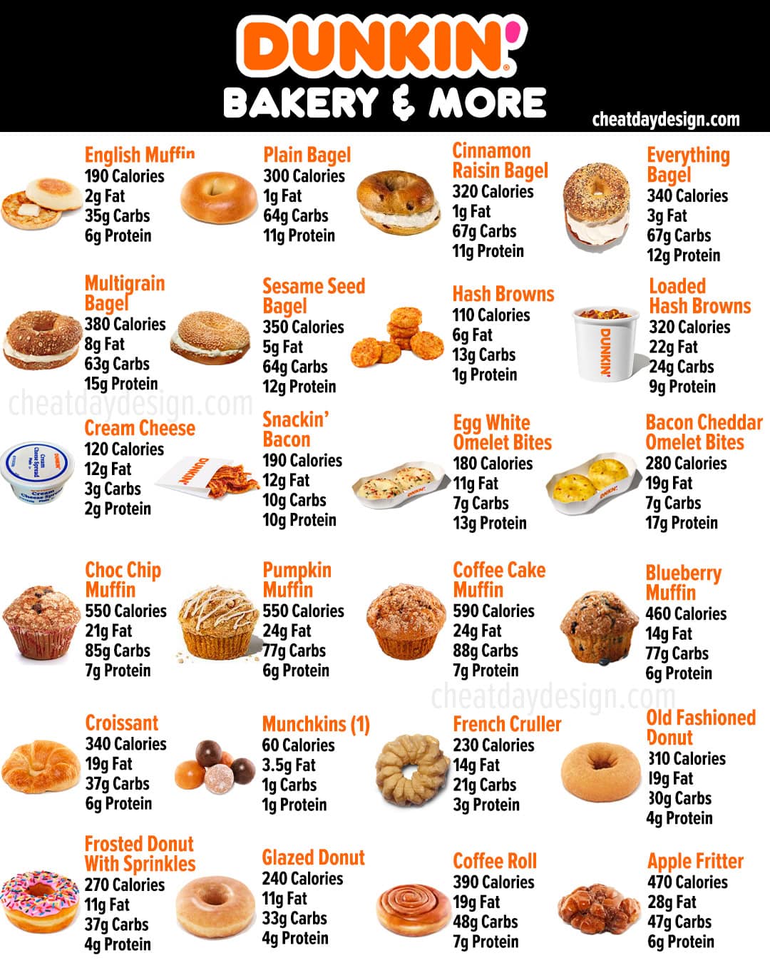 Most bagels at Dunkin’ will be between 300-400 calories, not including any cream cheese, and the muffins all fall between the 400-600 calorie range.