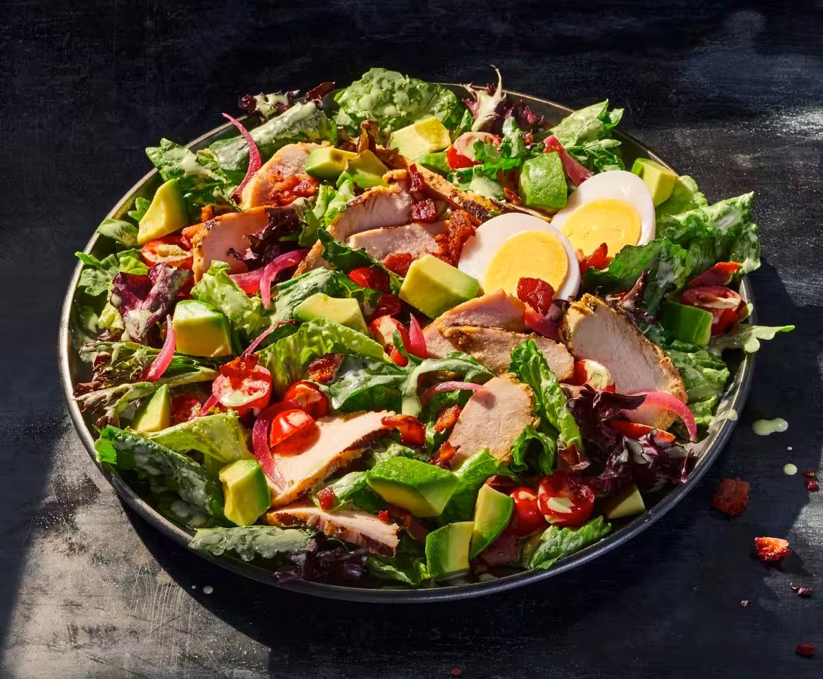 The Parmesan Caesar Salad and Apple Pecan Salad are both awesome options as well- each salad comes to 540 calories with 32 grams of protein (with dressing included). They may take the crown as being better protein sources overall, especially when you remove the dressing, but they still do not contain as much protein as the cobb salad.