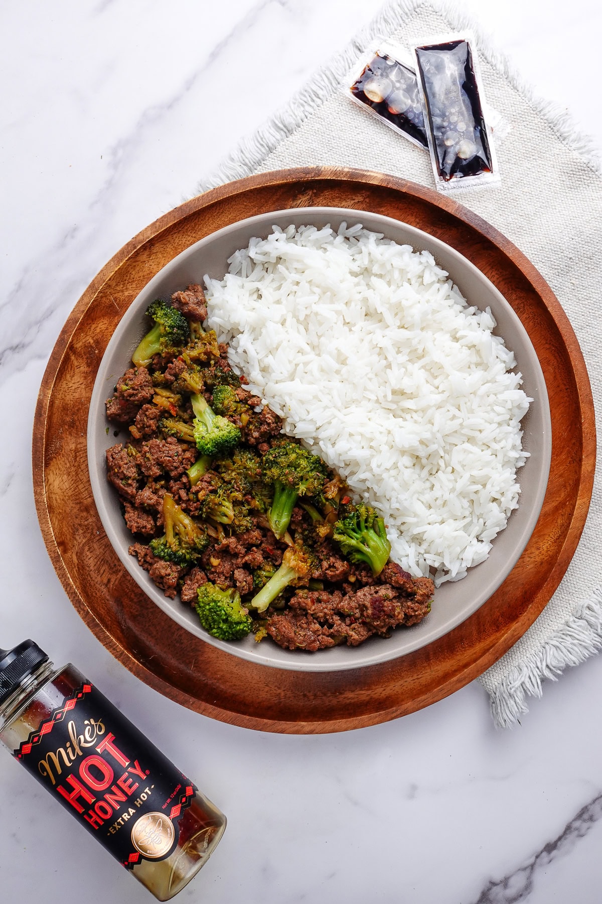 The main ingredients in our sauce for the Hot Honey Ground Beef & Broccoli are hot honey (obviously) and soy sauce.