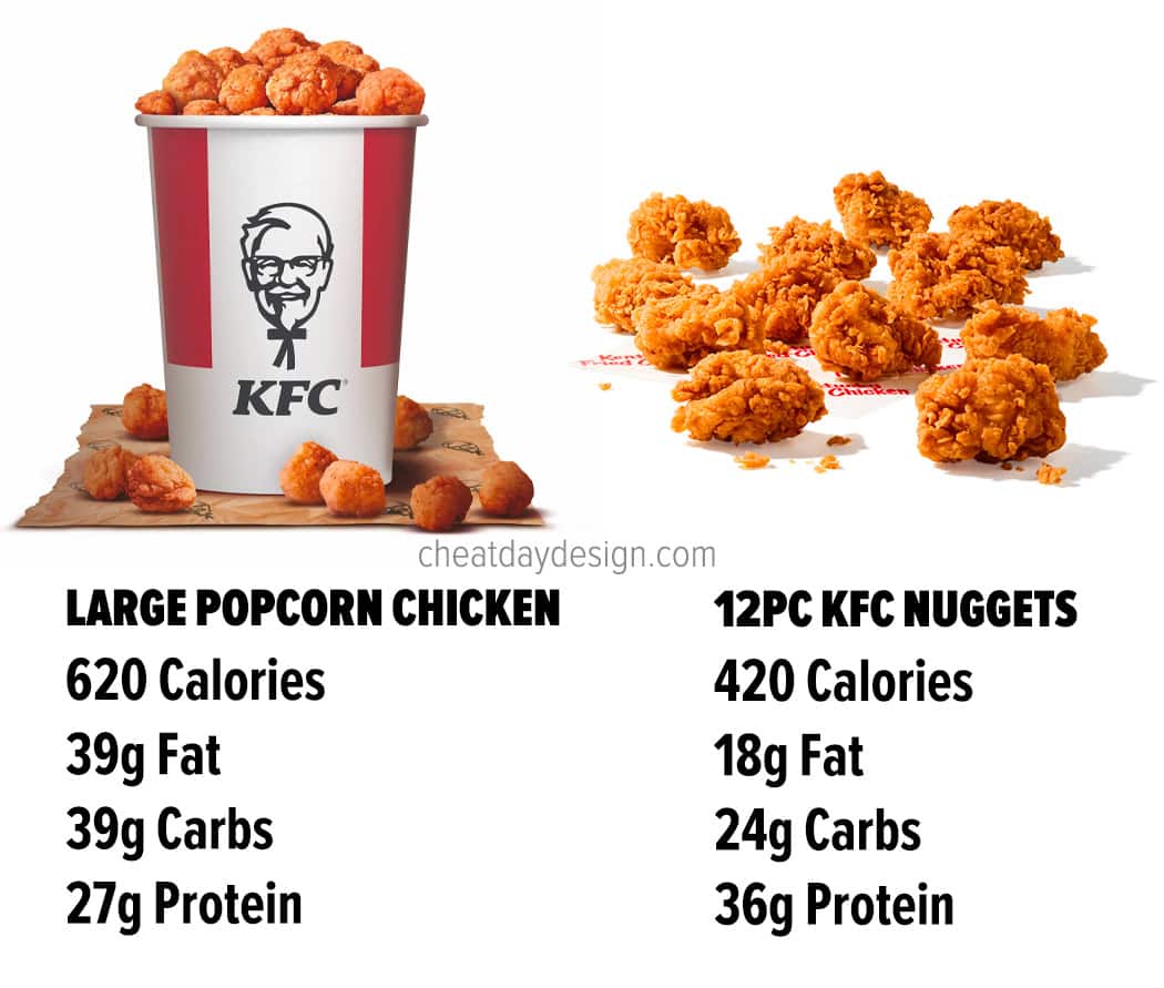 A large order of popcorn chicken from KFC contained 620 calories, 39g fat, 39g carbs, and 27g protein. A 12-piece order of KFC nuggets contains 420 calories, 18g fat, 24g carbs, and 36g protein.