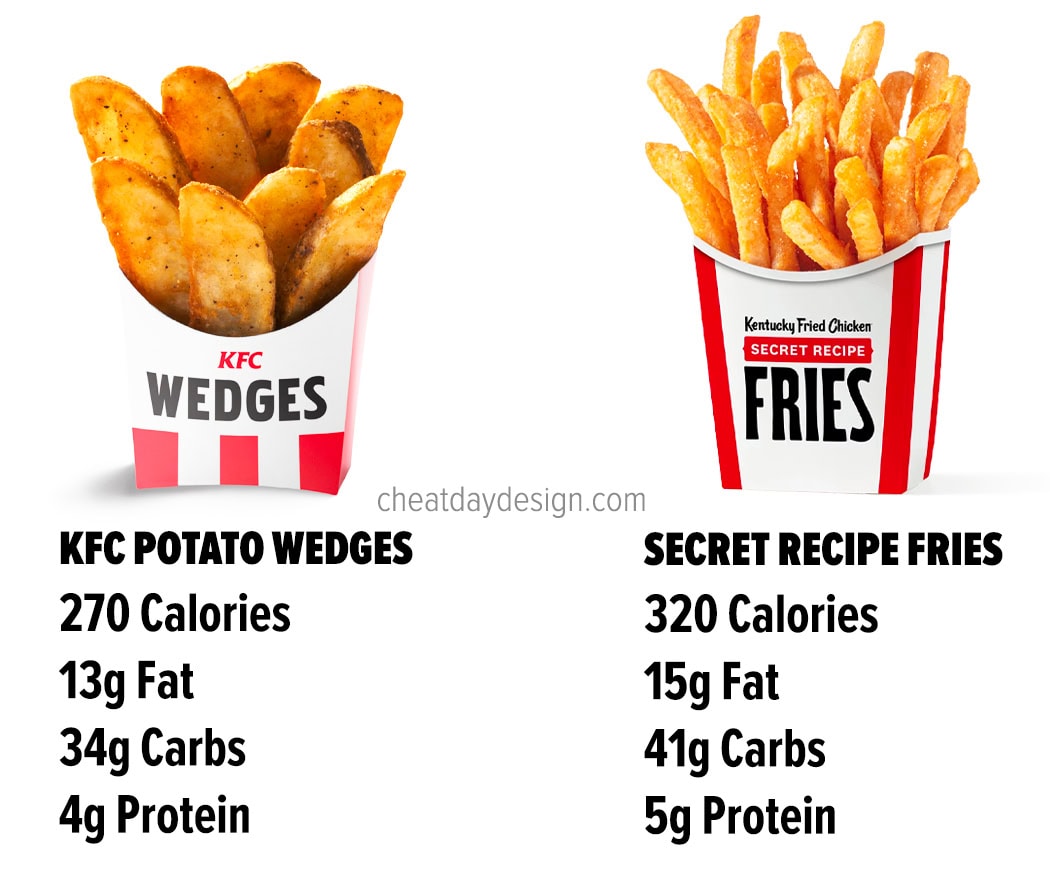How do the KFC fries compare to the wedges? Nutritionally, they are quite similar, with an order of fries containing just 50 calories more than the potato wedges.