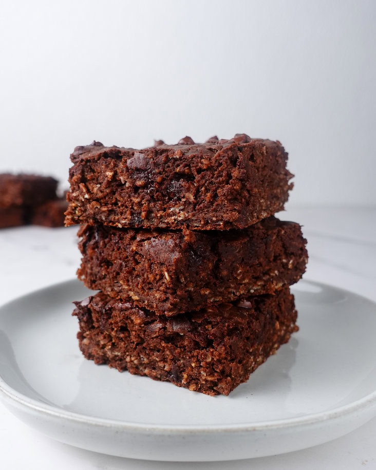The gooey brownies are the perfect fusion of breakfast and dessert. They taste like a decadent chocolatey brownie, but have all the nutrients of a delicious bowl of high-protein oatmeal.