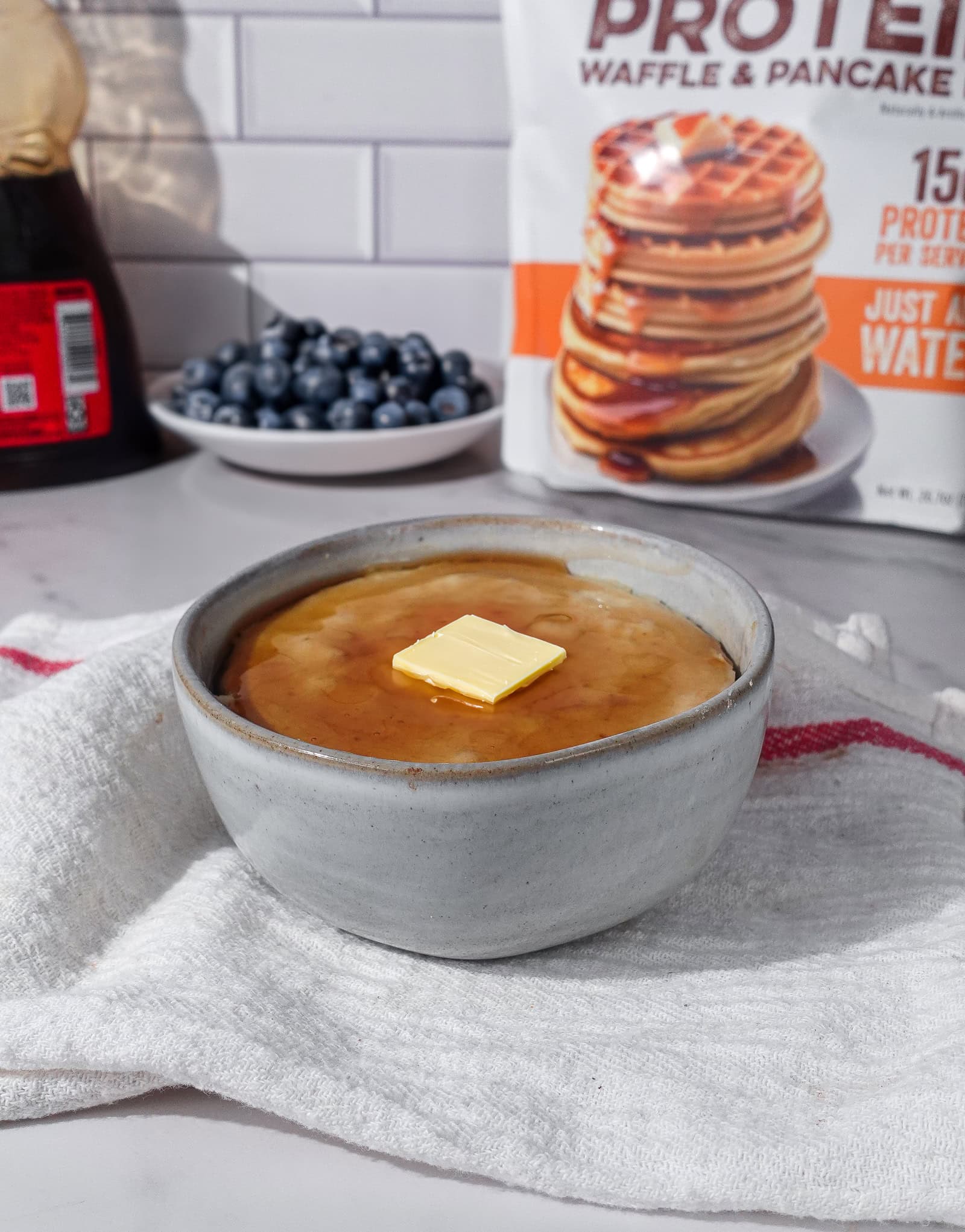 To kick things up a notch, we’re going to use a high-protein pancake mix to start our day off right.