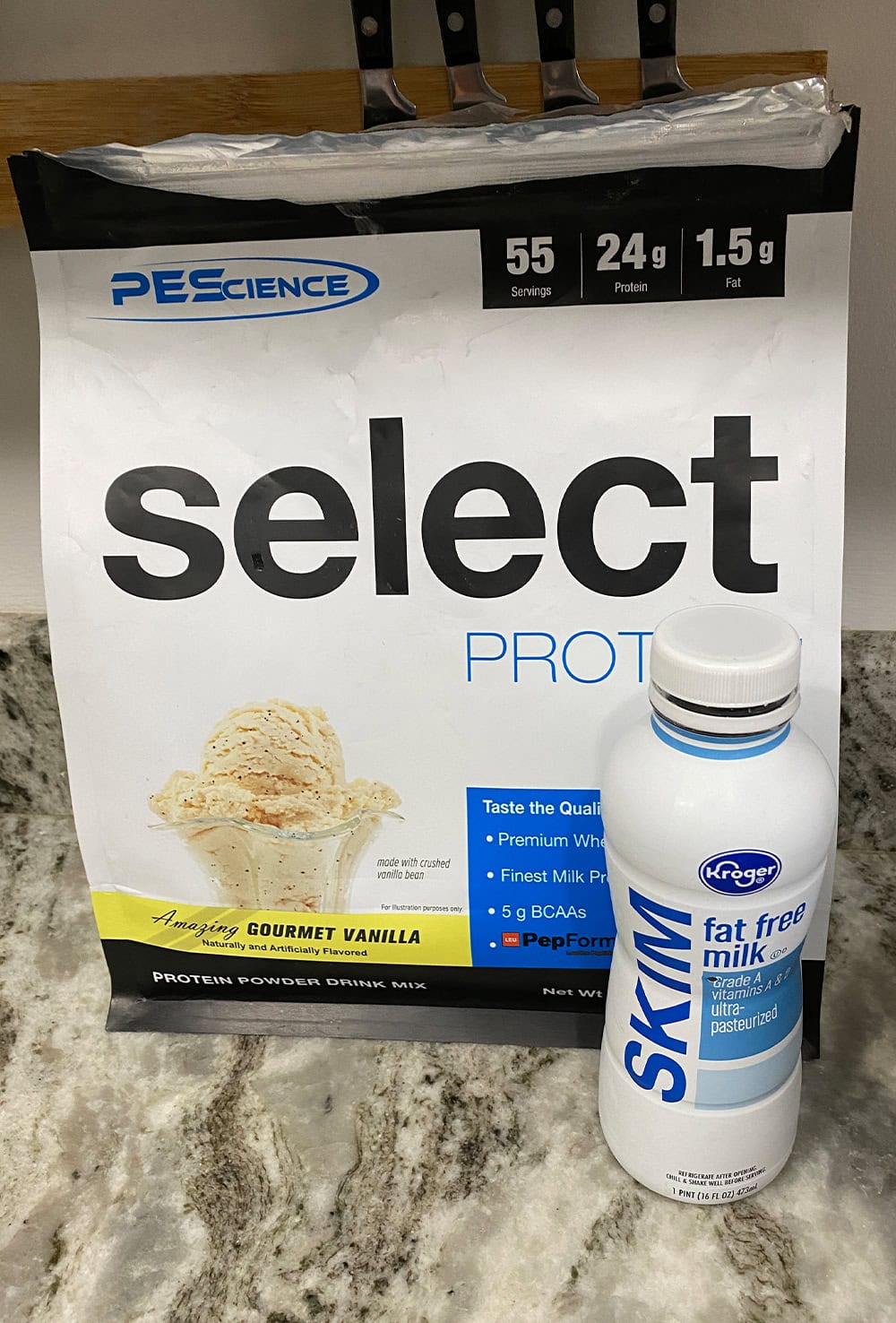 Outside of skim milk and protein powder, all we need is vanilla extract and some powdered sugar.