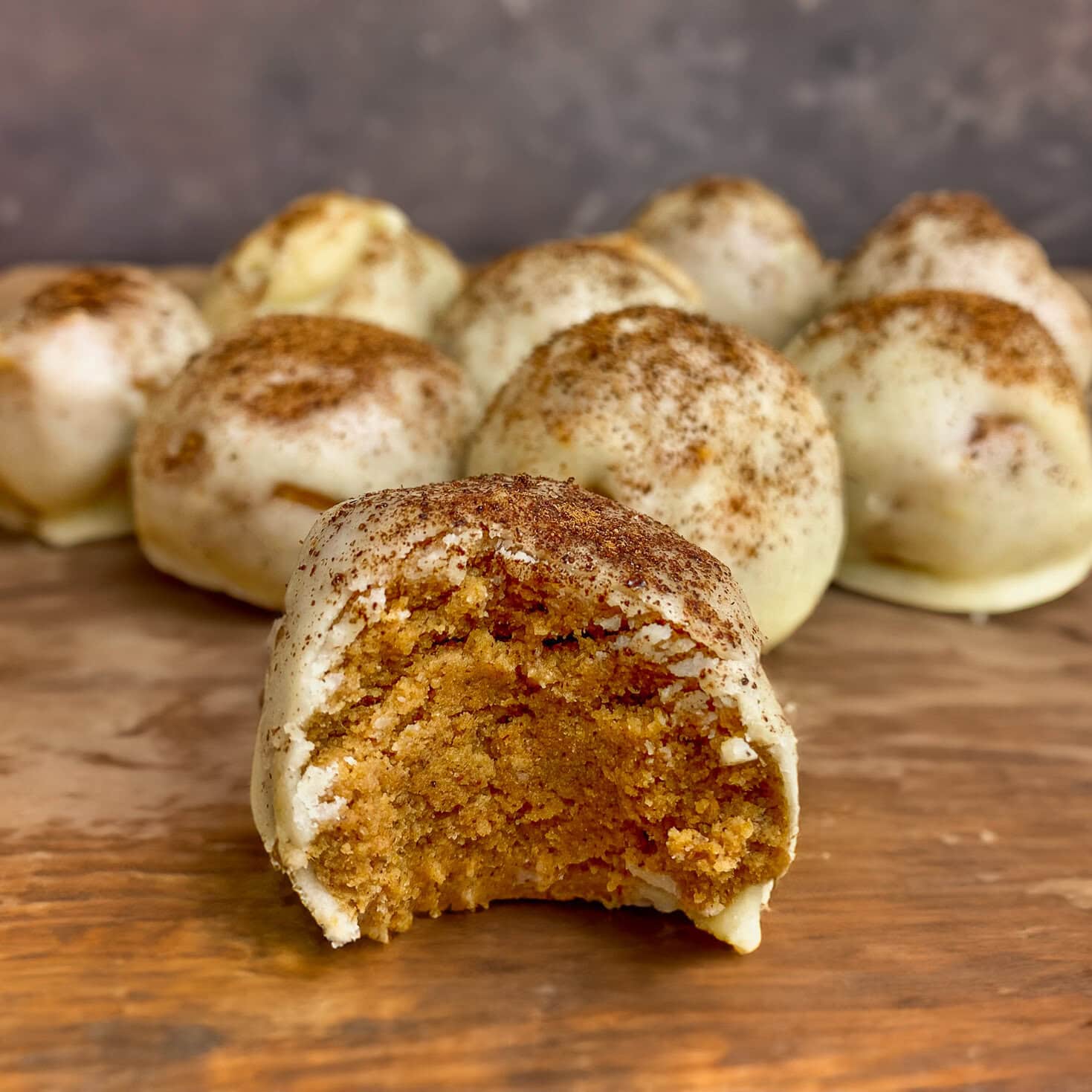 - Place each ball on a spoon, drop into the melted chocolate, roll to fully coat, then return to the baking sheet. Repeat for all 10. While still wet, sprinkle some pumpkin spice & espresso powder on top.
