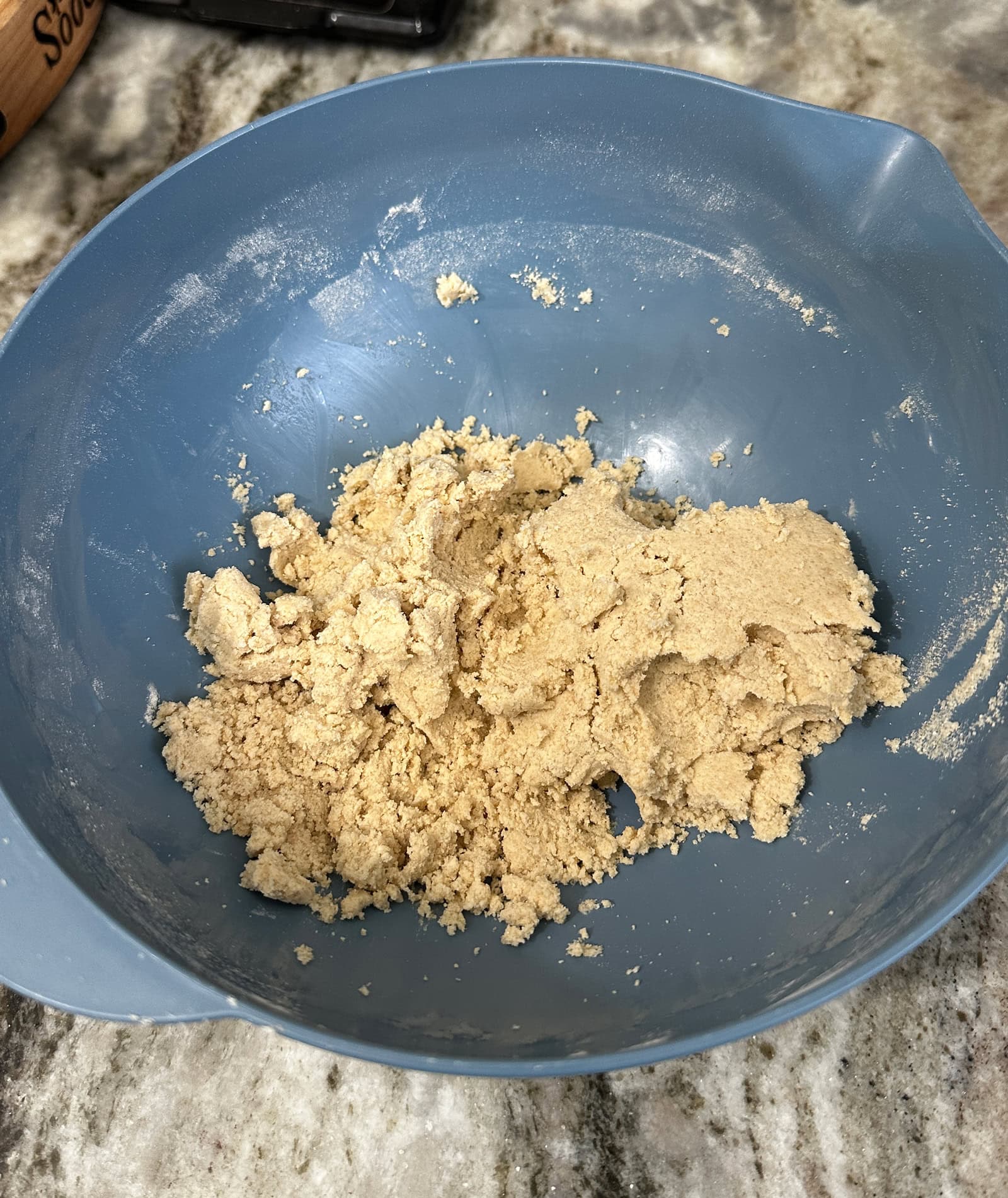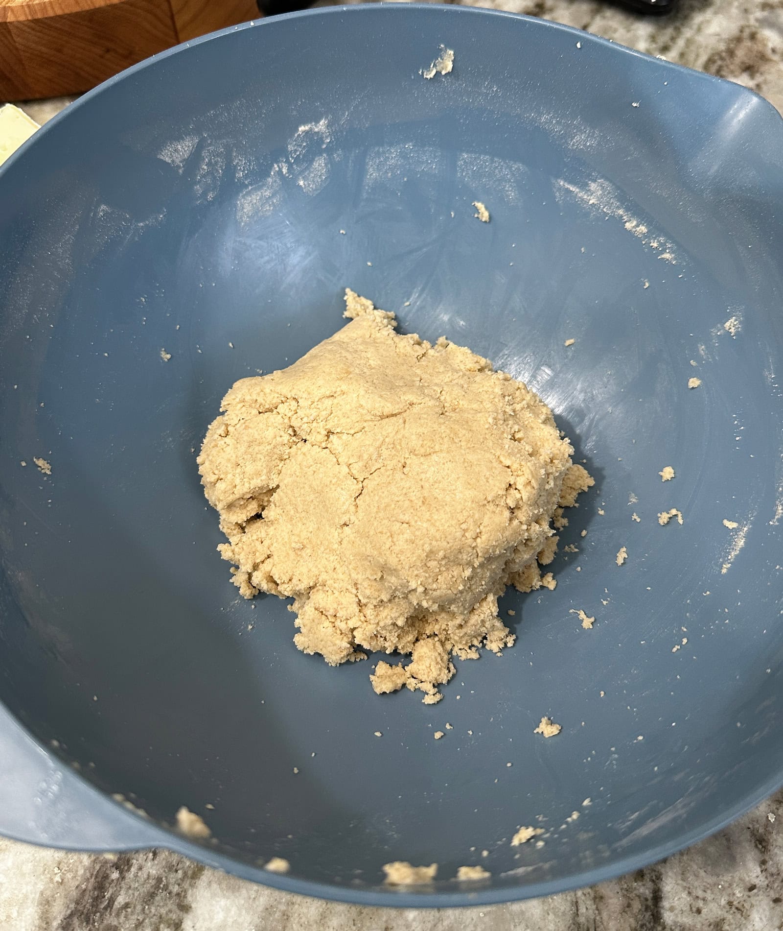 Use your hands to bring everything together until there are a few stray crumbs but it mostly all holds together in a dough ball.