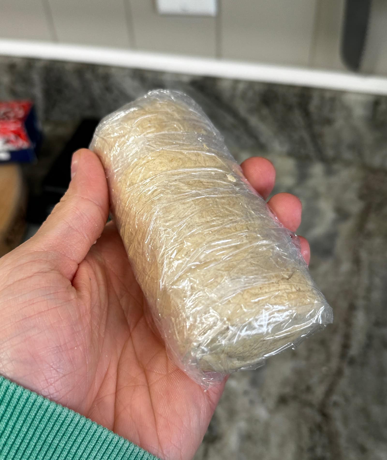 Take the raw cookie dough, add it to some plastic wrap, and roll it into a tube.