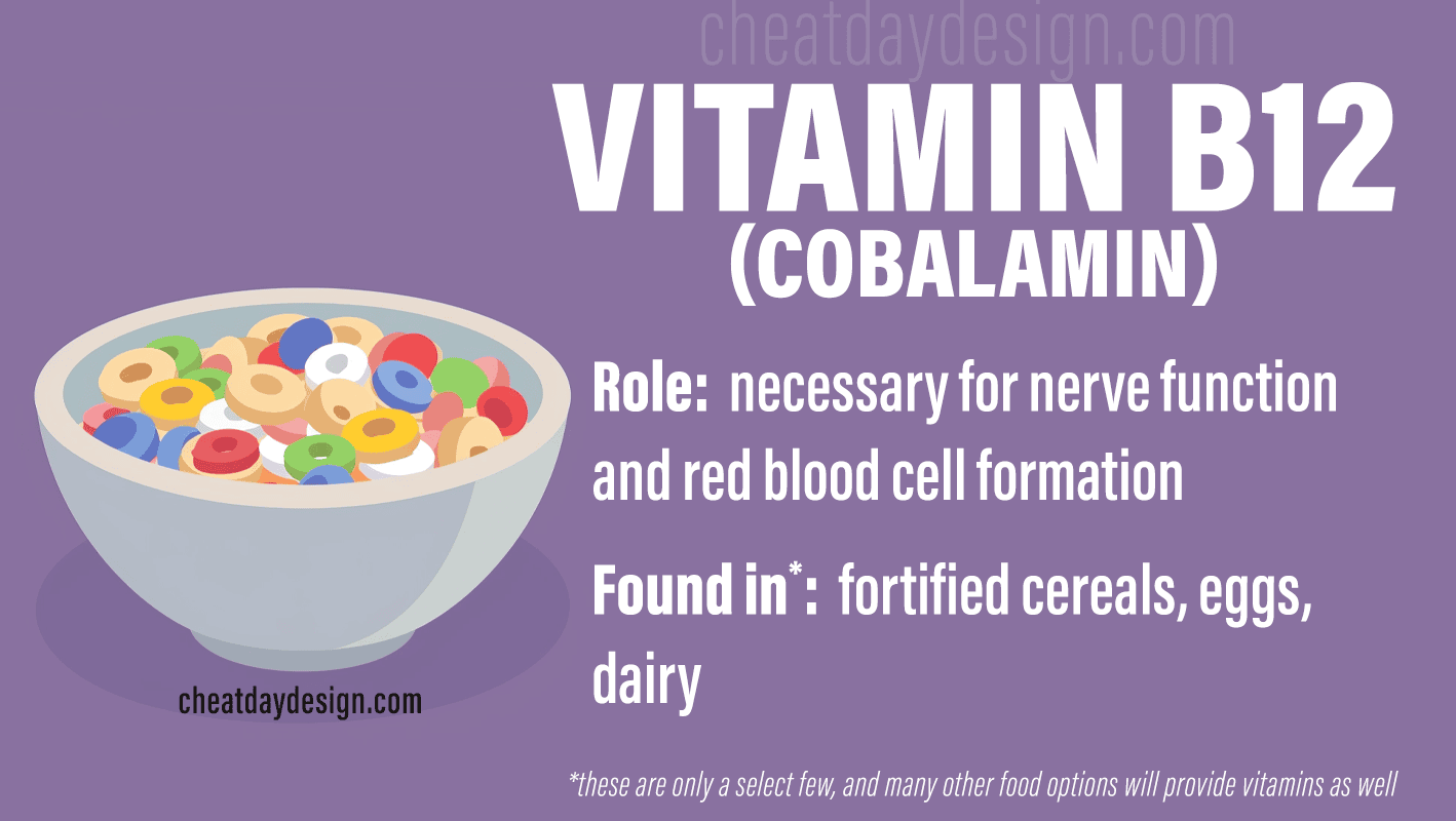 Vitamin B12 can be found in animal products like meat (poultry, pork, beef, and fish) and dairy, or plant-based foods like fortified cereals. B12 is also a very popular vitamin to be found in energy drinks & supplements.