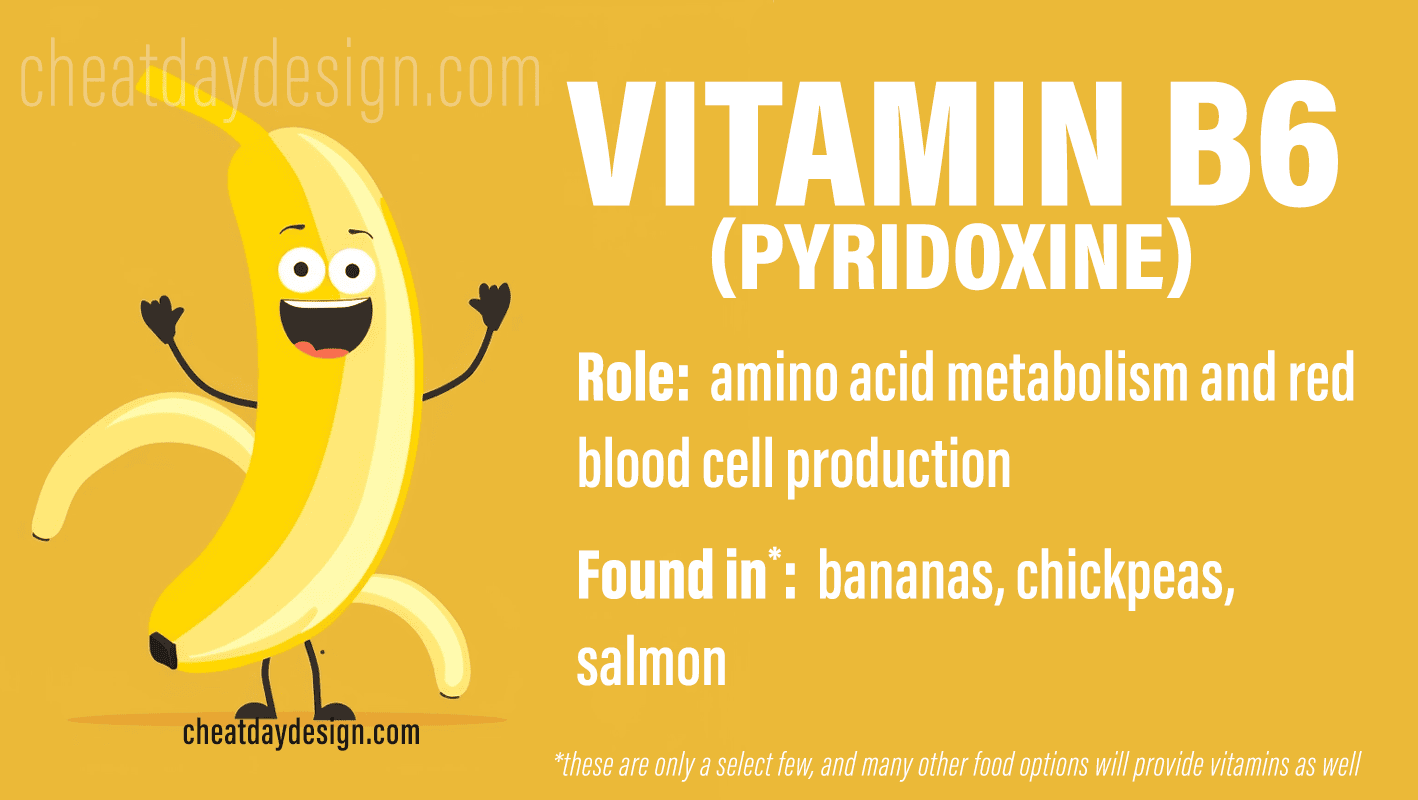 Foods high in vitamin B6 include bananas, meat, poultry, fish, legumes, nuts, eggs and fortified cereals.
