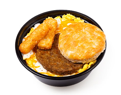 At 940 calories, it’s a meal designed to satisfy the biggest of breakfast appetites. With sausage, eggs, a biscuit, hashbrowns, cheese, and gravy, this breakfast bowl packs a punch in flavor and will keep you full all morning long…unless you have an insane appetite.